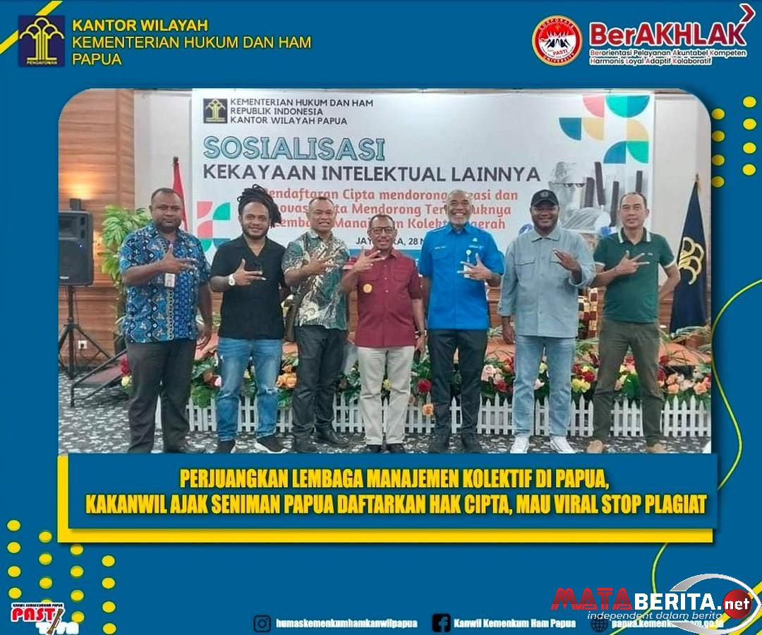 “Mau viral stop plagiat, kerja keras Kanwil Papua bersama Dinas Pariwisata Kota Jayapura, untuk daftarkan Hak Cipta Khusus untuk para Seniman, dengan target Membentuk Lembaga Manajen Kolektif di Tanah Papua,” sampai Kepala Kanwil (Kakanwil) Anthonius M. Ayorbaba pada Kamis (28/03/2024). Dia pun menekankan pentingnya perlindungan KI khususnya ciptaan berupa lagu kepada penggiat seni dan siswa/siswi SMP dan SMA yang menjadi juara pada perlombaan Cipta Lagu di lingkungan sekolah se Kota Jayapura.