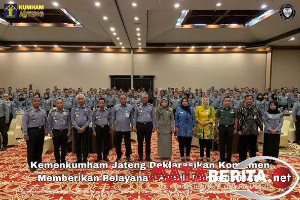Surakarta, mataberita.net — Kantor Wilayah Kementerian Hukum dan HAM Jawa Tengah (Kanwil Kemenkumham Jateng) mendeklarasikan Pencanangan Pelayanan Publik Berbasis Hak Asasi Manusia (HAM), pada Selasa (27/02/2024). Deklarasi yang terpusat di The Sunan Hotel Surakarta tersebut dipimpin oleh Kepala Kanwil (Kakanwil) Tejo Harwanto. Pembacaan deklarasi diikuti oleh Pimpinan Tinggi Pratama dan Pejabat Administrasi serta seluruh Kepala Unit Pelaksana Teknis (UPT) di lingkungan Kemenkumham Jateng.