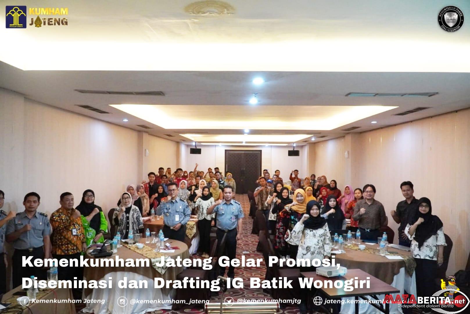 Surakarta, mataberita.net — Kantor Wilayah Kementerian Hukum dan HAM Jawa Tengah (Kanwil Kemenkumham Jateng) menyelenggarakan kegiatan Promosi dan Diseminasi Indikasi Geografis serta Indikasi Geografis Drafting Batik Wonogiri. Yang mana bertempat di England Hotel Surakarta, pada Selasa (27/02/2024). Kegiatan ini dibuka oleh Kepala Bidang Pelayanan Hukum, Agustinus Yosi Setyawan. Dalam sambutannya, Indikasi Geografis berperan sebagai jaminan kualitas, karakteristik, dan reputasi suatu produk.