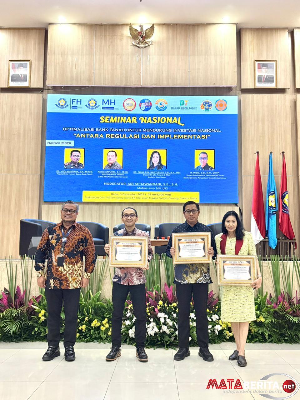 Jakarta, mataberita.net- Program Magister Hukum (MH) Universitas Kristen Indonesia (UKI) menyelenggarakan Seminar Nasional bertema “Optimalisasi Bank Tanah untuk Mendukung Investasi Nasional Antara Regulasi dan Implementasi”. Kegiatan ini berlangsung di Auditorium Grha William Soeryadjaya FK UKI, Jakarta Timur, pada Rabu (03/12/25).