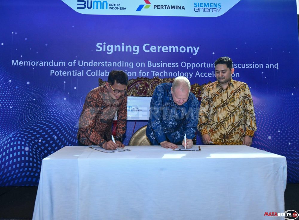 Jakarta, mataberita.net — PT Pertamina (Persero) berkolaborasi dengan Siemens Energy mewujudkan energi berkelanjutan yang aman dan terjangkau di Indonesia. Sinergi ini ditandai penandatanganan Nota Kesepahaman mengenai pembahasan peluang bisnis dan potensi kolaborasi untuk percepatan teknologi. Yang mana dilaksanakan pada Selasa (13/08/2024) di Jakarta. Nota Kesepahaman ditandatangani oleh Direktur Strategi, Portofolio, dan Pengembangan Usaha Pertamina Salyadi Saputra dengan Thorbjörn Fors selaku Senior Vice President dan Managing Director Siemens Energy Asia Pacific.