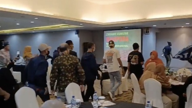 Kemudian, saat acara akan dimulai massa tersebut justru masuk ke dalam ruangan dan mulai melakukan aksi perusakan.