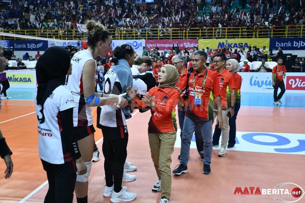 Bandung, mataberita.net — Direktur Utama PT Pertamina (Persero) Nicke Widyawati menghadiri pertandingan voli Proliga di Stadion Si Jalak Harupat, Kabupaten Bandung pada (08/06/2024). Kehadirannya memberikan semangat lebih bagi tim voli Pertamina yang tengah berlaga. Dalam pertandingan seru tersebut, Tim Putra Jakarta Pertamina Pertamax berhasil meraih kemenangan telak 3-0 melawan Jakarta Garuda Jaya. Kemenangan ini menunjukkan kekuatan dan kesiapan mereka untuk terus bersaing di Proliga 2024.